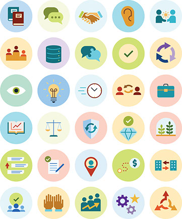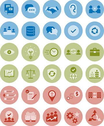 Various icons used as subcategories for larger sales categories divided by color.