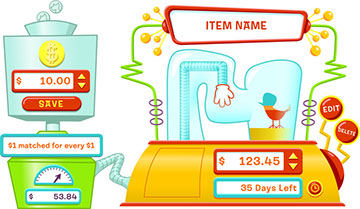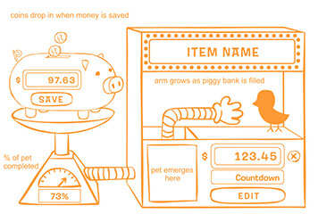 First sketch of Goal Machine UI. User sets goal of buying a real world item with the item's price. When user saves enough, they win a virtual pet.