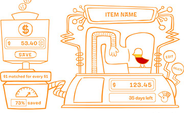 Bank appears for user to keep track of savings. Savings added causes mechanical arm to reach closer to virtual prize, which user wins when reaching goal.