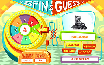User spins wheel for point value to guess the price of a random product. This teaches children about the actual dollar value of items.