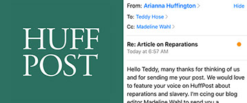 2/22/16 | President and editor-in-chief of The Huffington Post personally approves of my pitch, on the topic of reparations. Based on insights as an employee/resident for several years in Harlem.